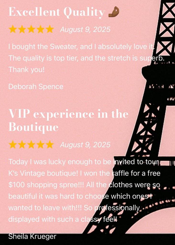 Your feedback not only warms my heart but also lets new shoppers know that K’s Vintage Boutique is the real deal — quality you can feel, service you can trust, and pieces worth falling in love with.